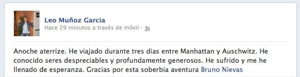 «Anoche aterricé. He viajado durante tres dias entre Manhattan y Auschwitz. He conocido seres despreciables y profundamente generosos. He sufrido y me he llenado de esperanza. Gracias por esta soberbia aventura». Leo Muñoz en Facebook.